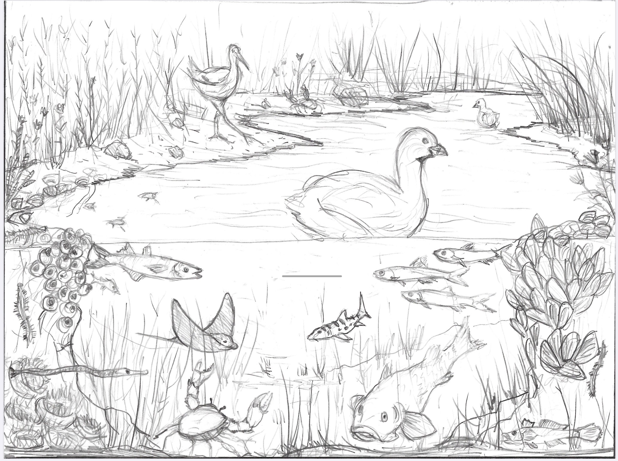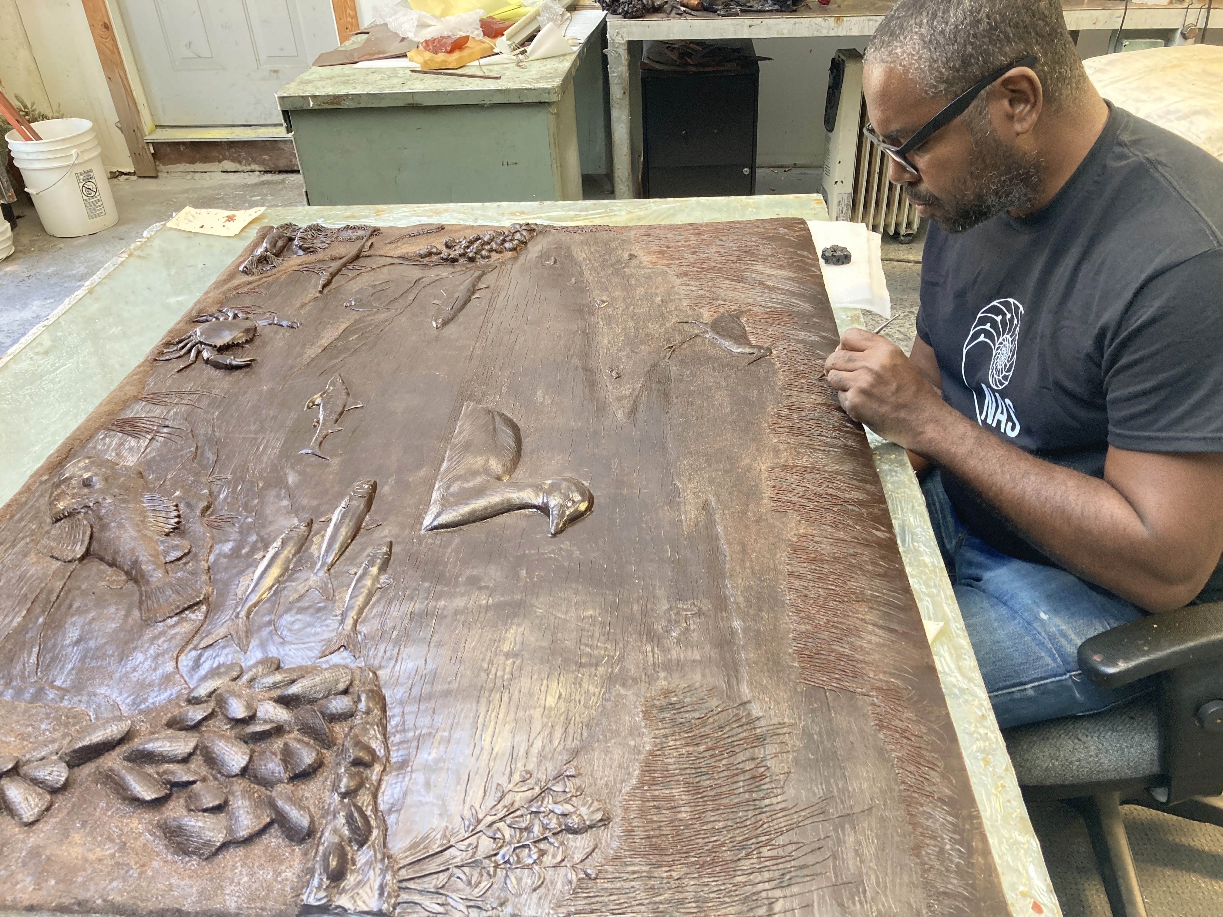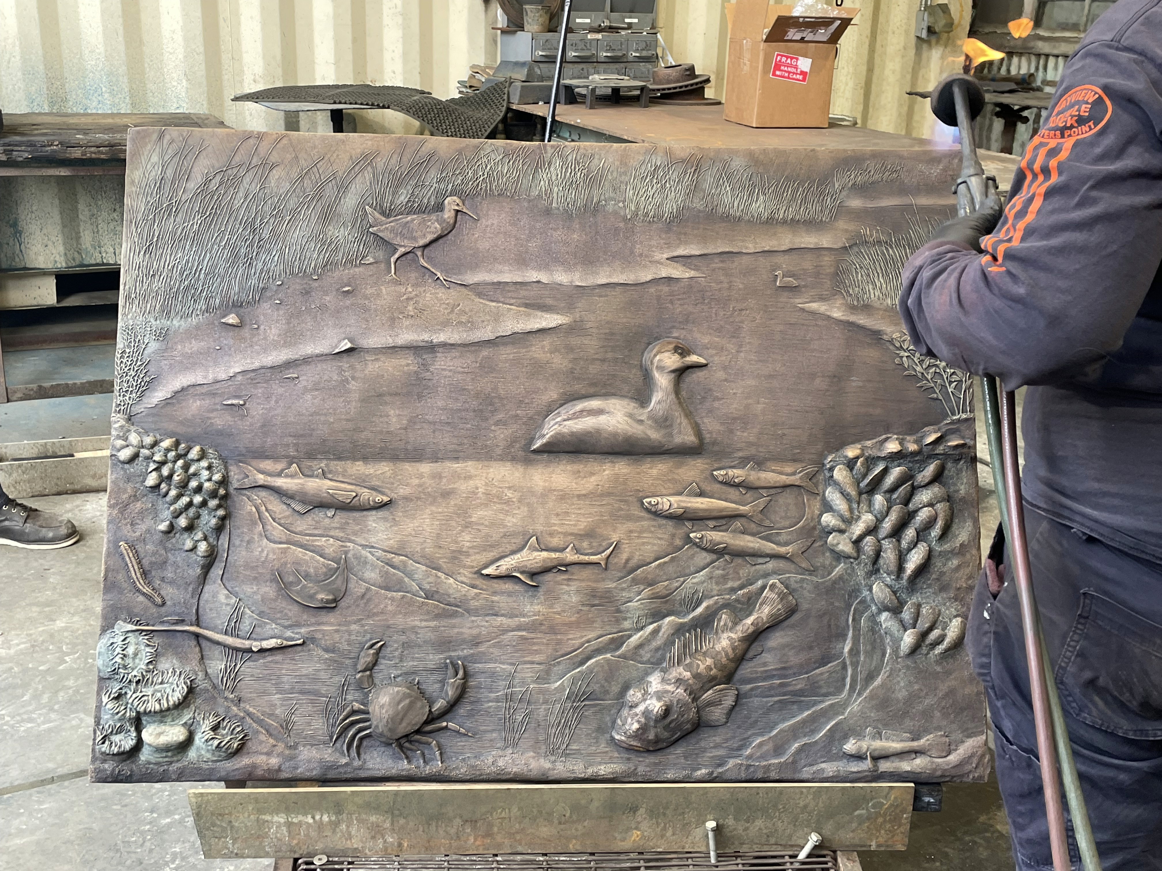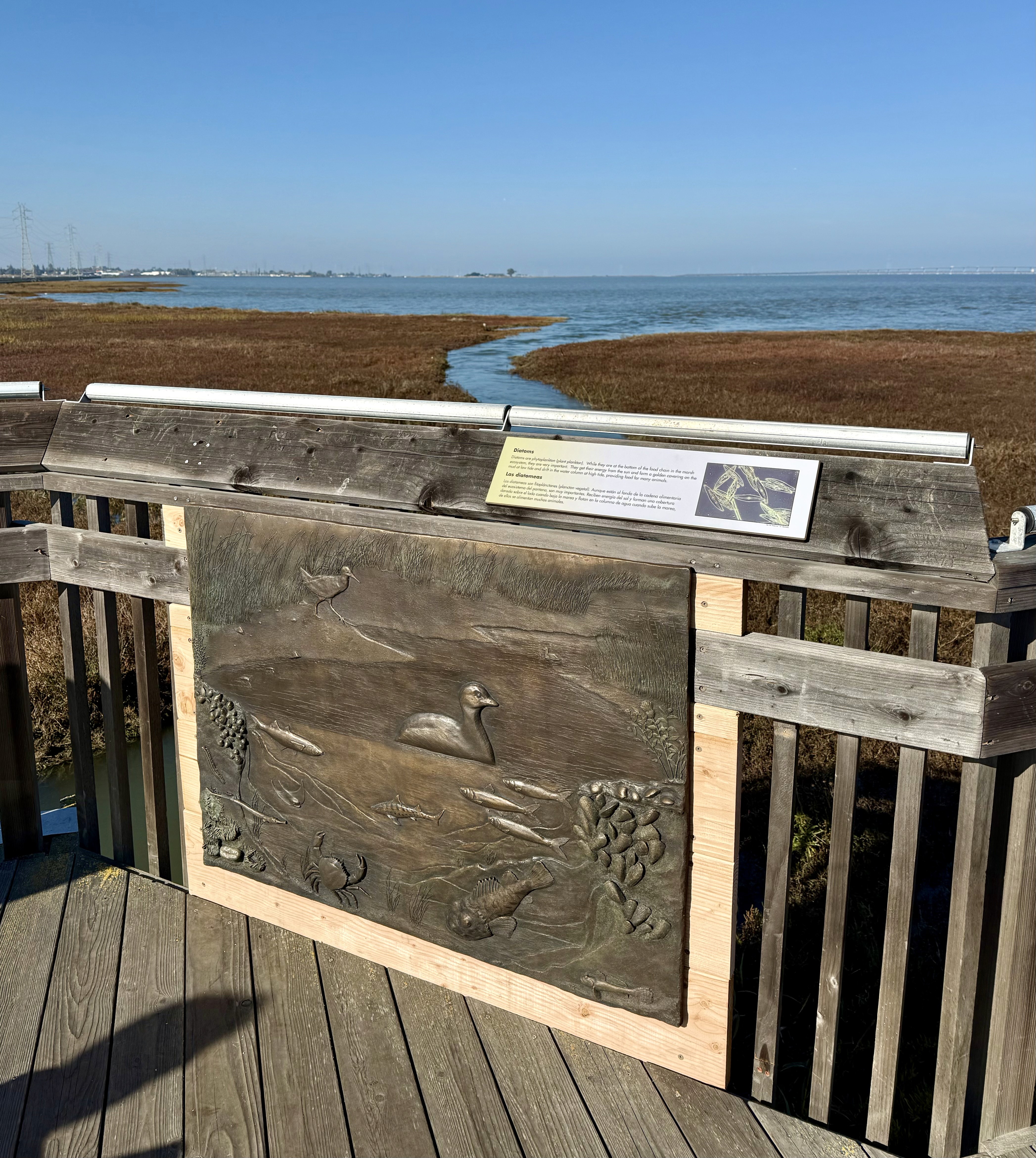 This bronze relief sculpture was commissioned to depict a cross-section showing the biodiversity of animals and plants living above and below the water line in the San Francisco Bay wetlands.