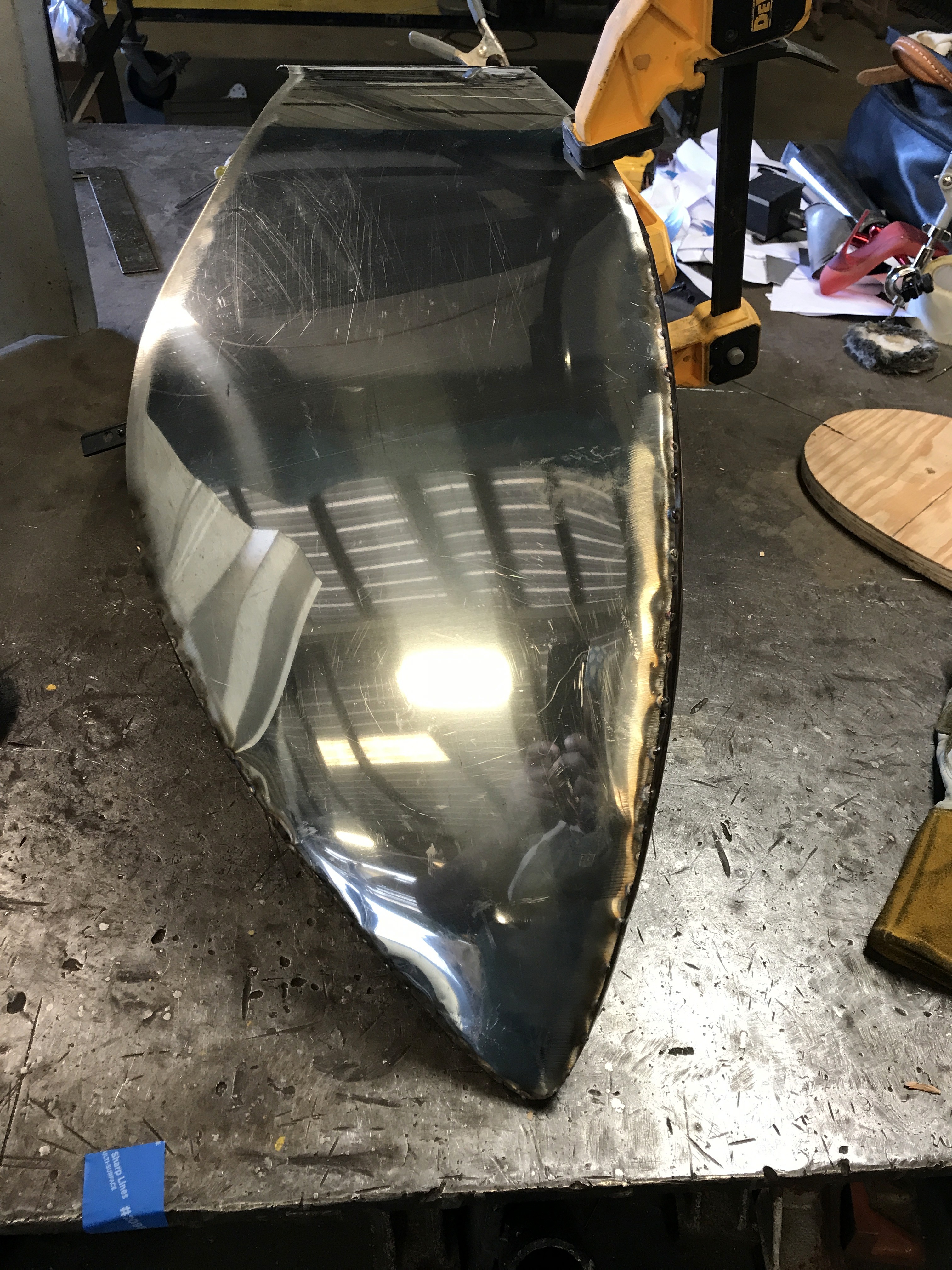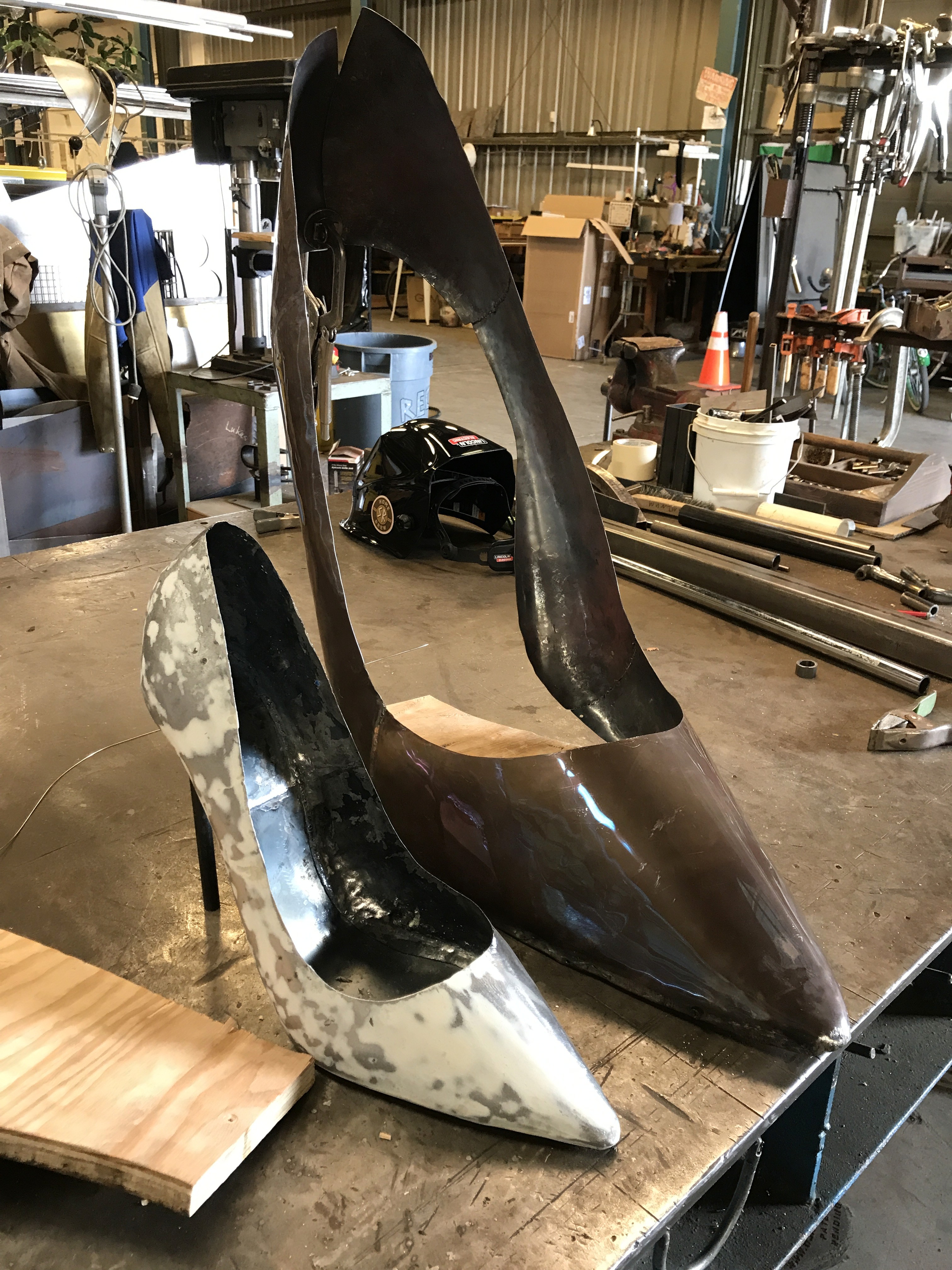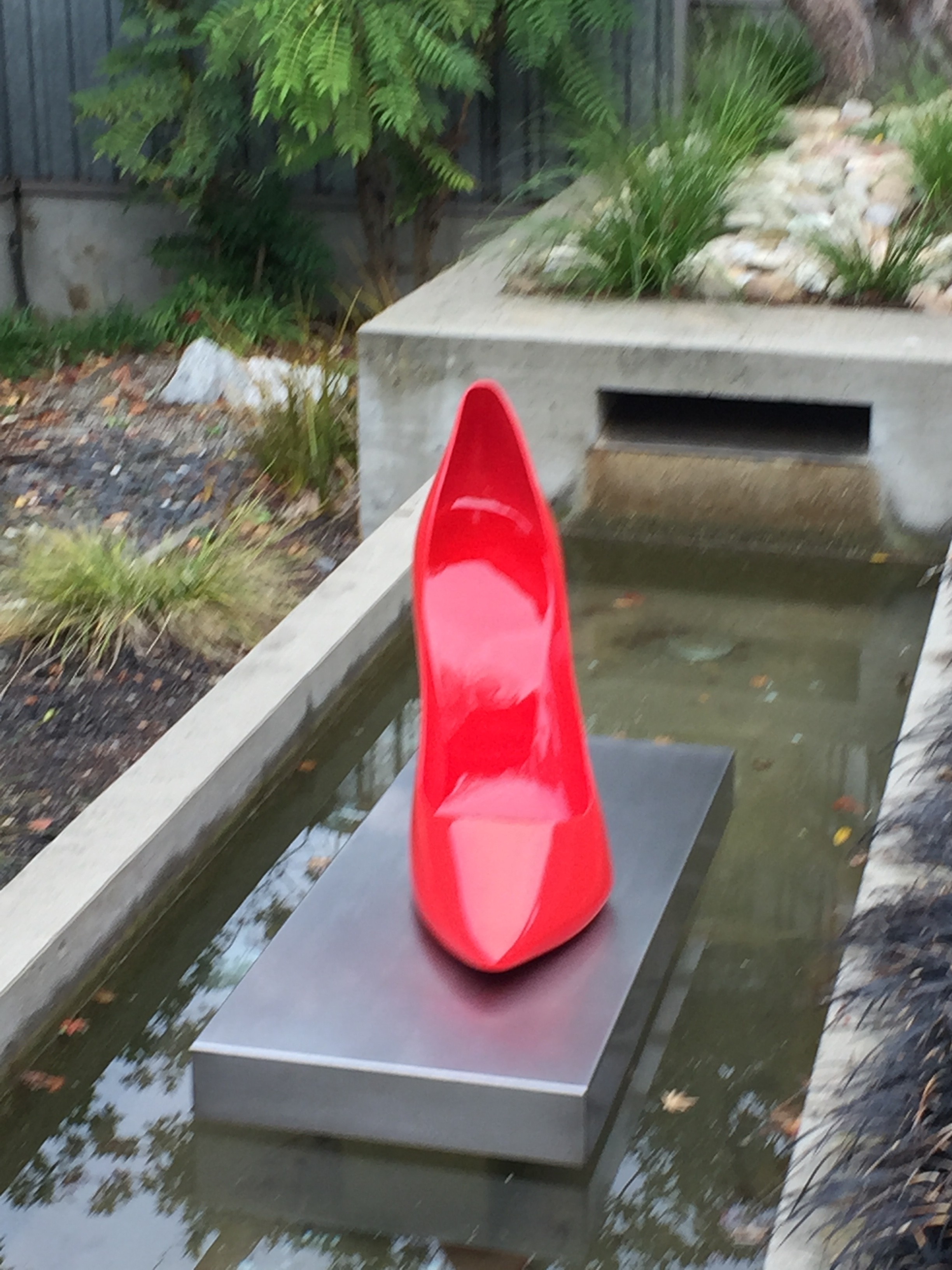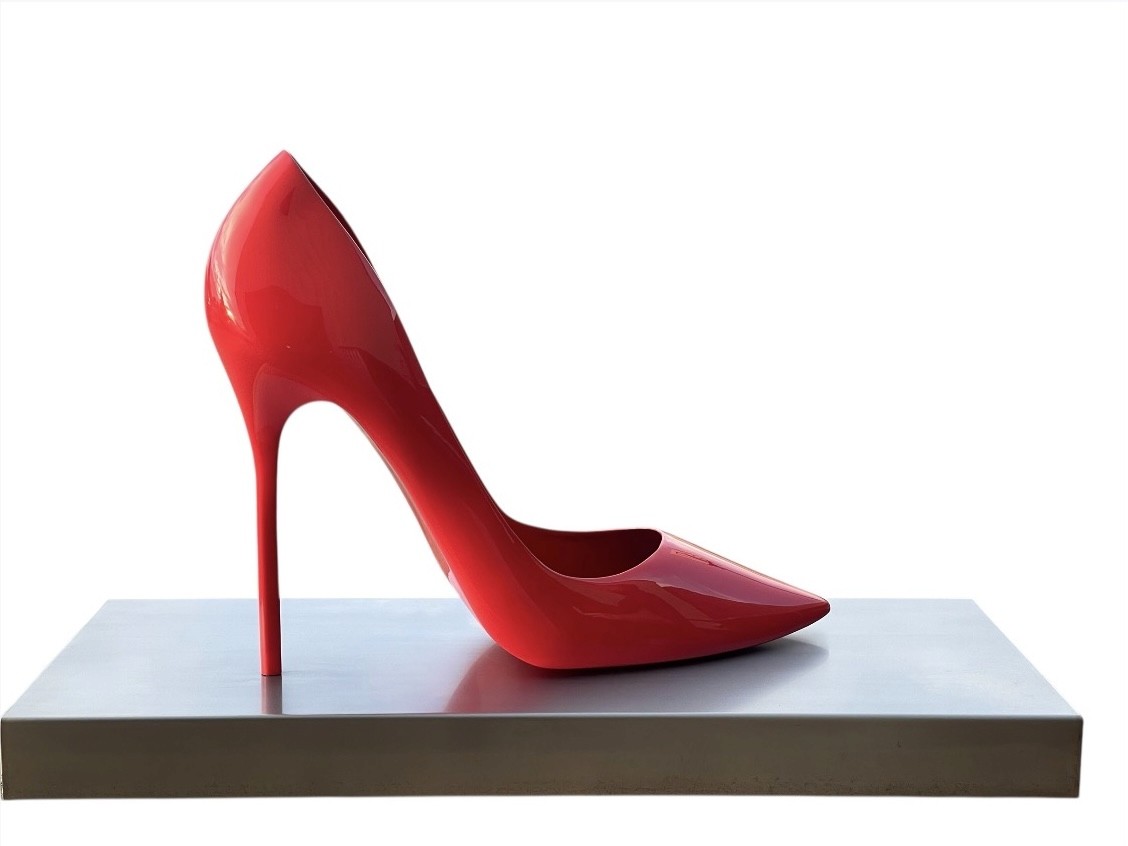 A custom fabricated red high heel shoe, hand forged from 304 stainless steel. The shoe stands approximately 20” and 26” Long.